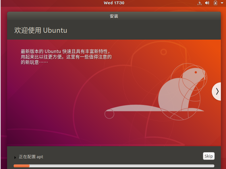 等待系统启动,进入欢迎界面,选中“中文(简体)”,并点击“安装 Ubuntu”按钮;