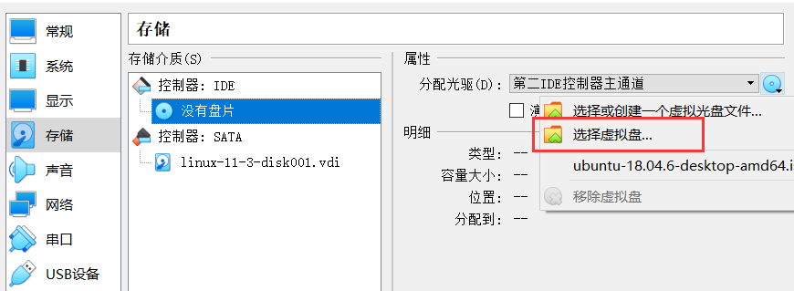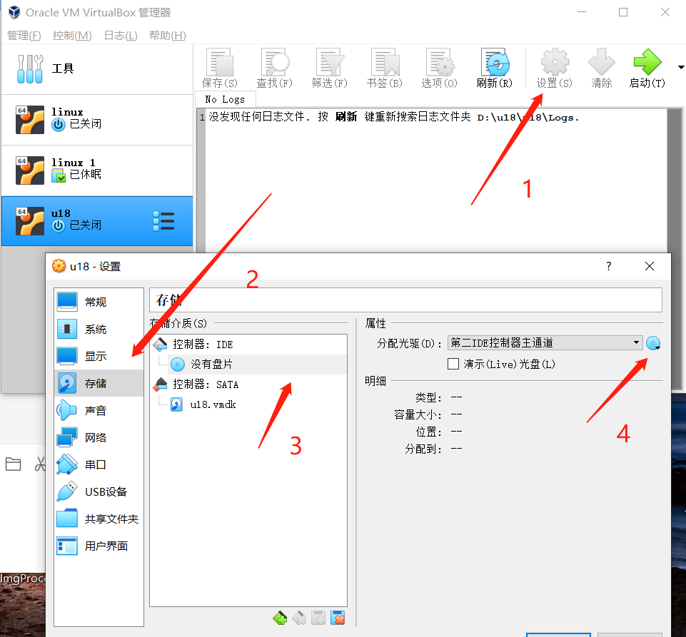 在Virtual box中找到之前安装的虚拟机,进入设置,并在存储中给控制器分配光盘: