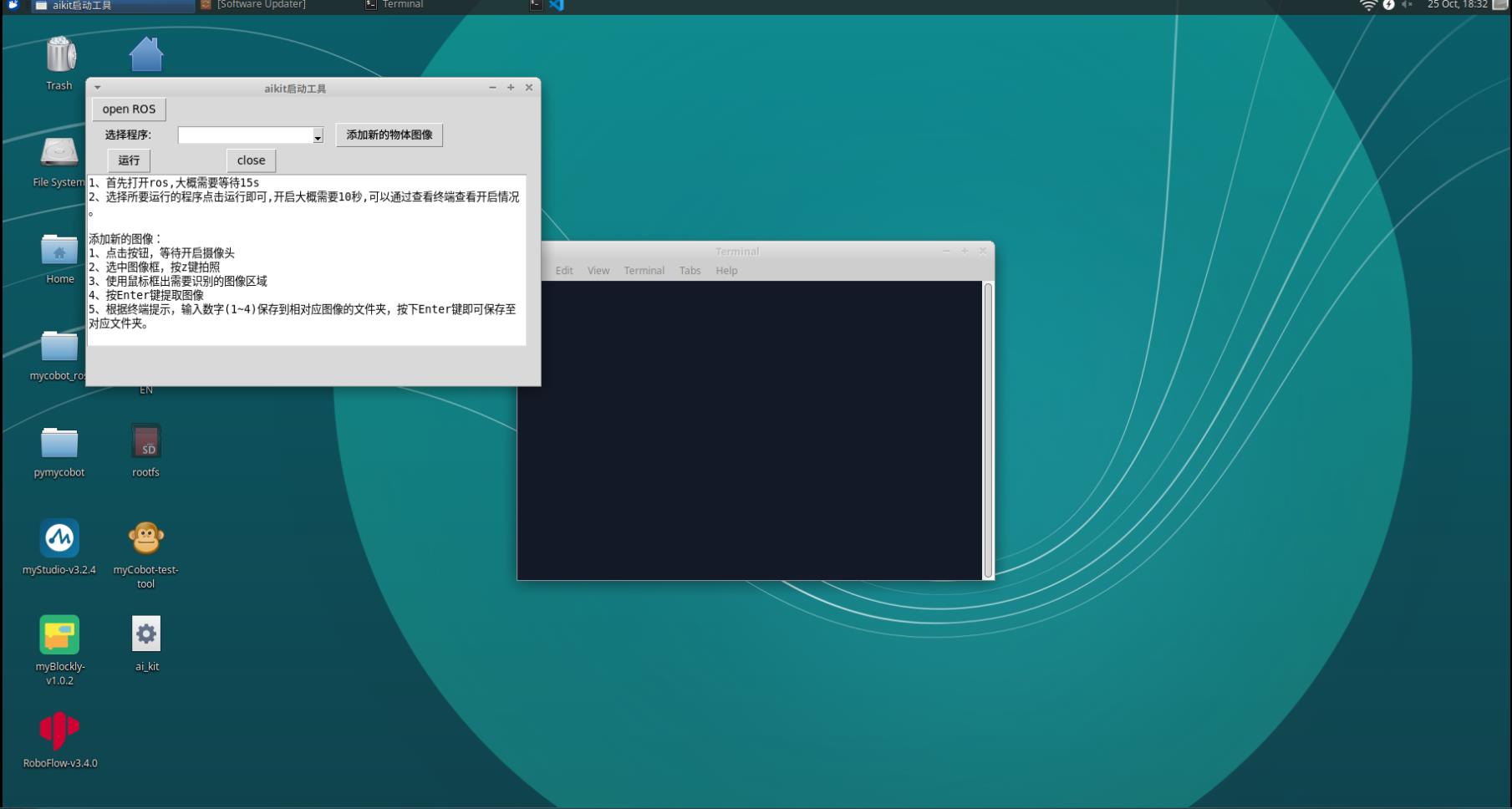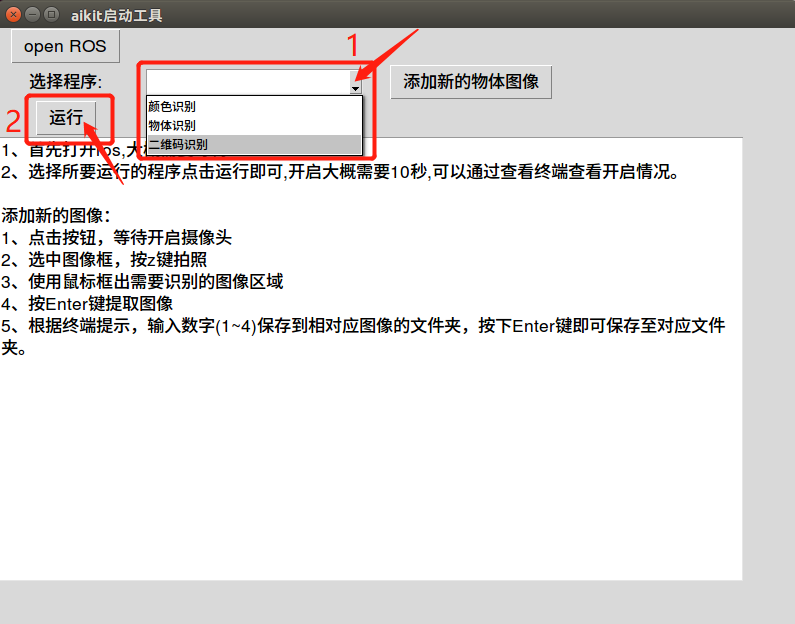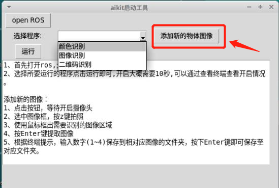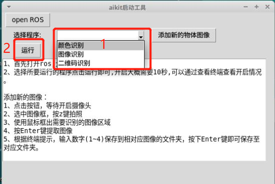 为避免输入过多繁琐命令使用人工智能套装,这里准备了一个aikit一键启动工具,包括颜色识别、图像识别、增加图像。用户根据日志提示信息使用该工具。目前提供280 PI版本和280 M5版本。