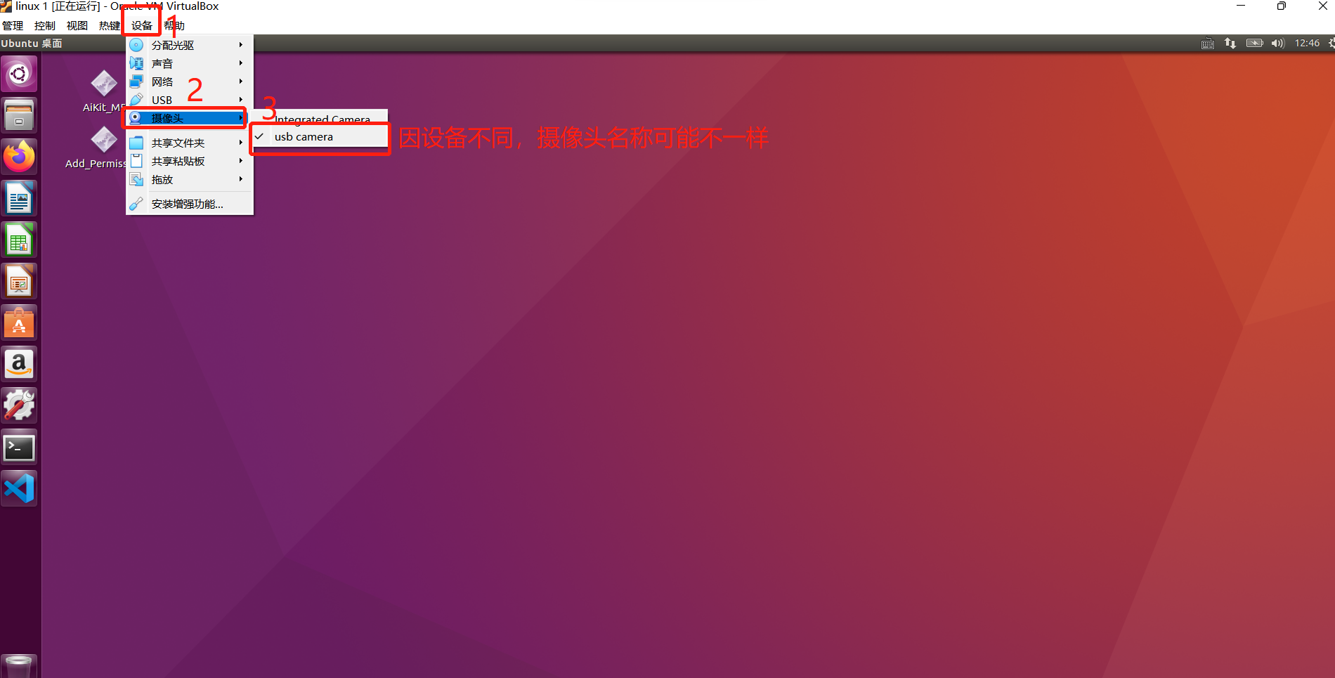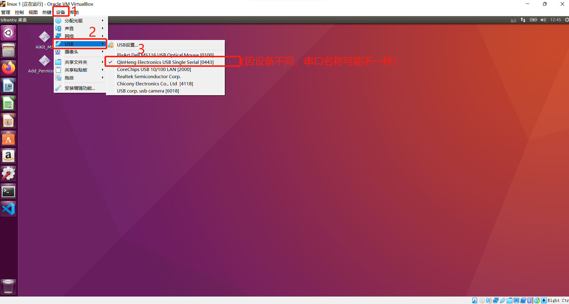 连接机械臂并且进入系统后,鼠标依次选中系统上方的 设备-->USB-->勾选机械臂串口名称