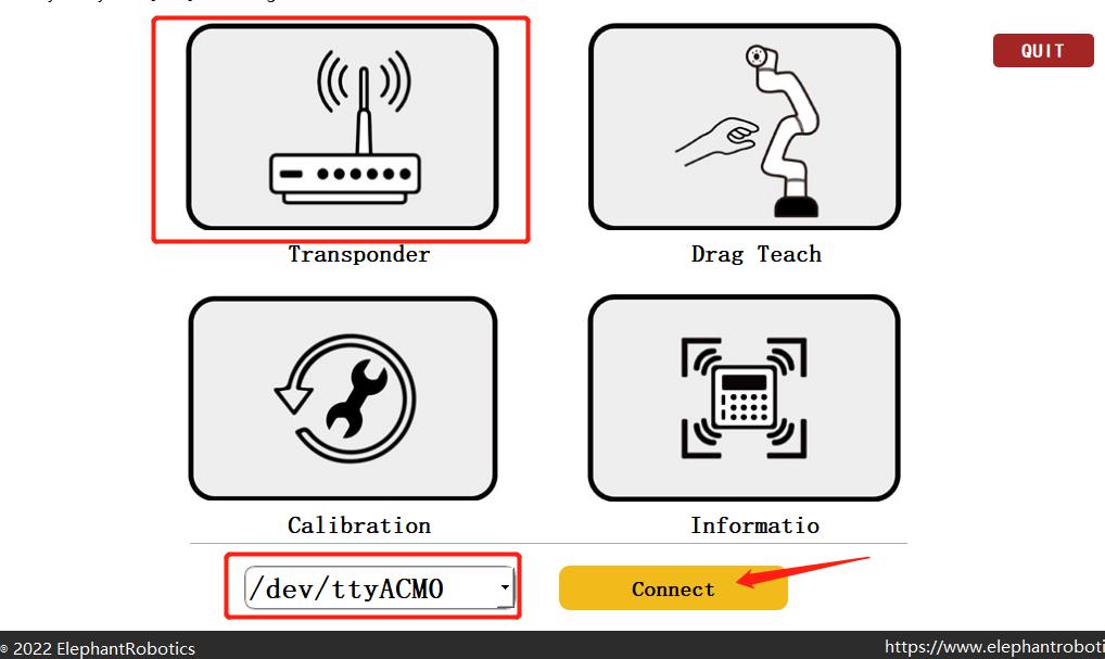2.选择“Transponder”, 端口选择“/dev/ttyACM0”, 点击Connect.
