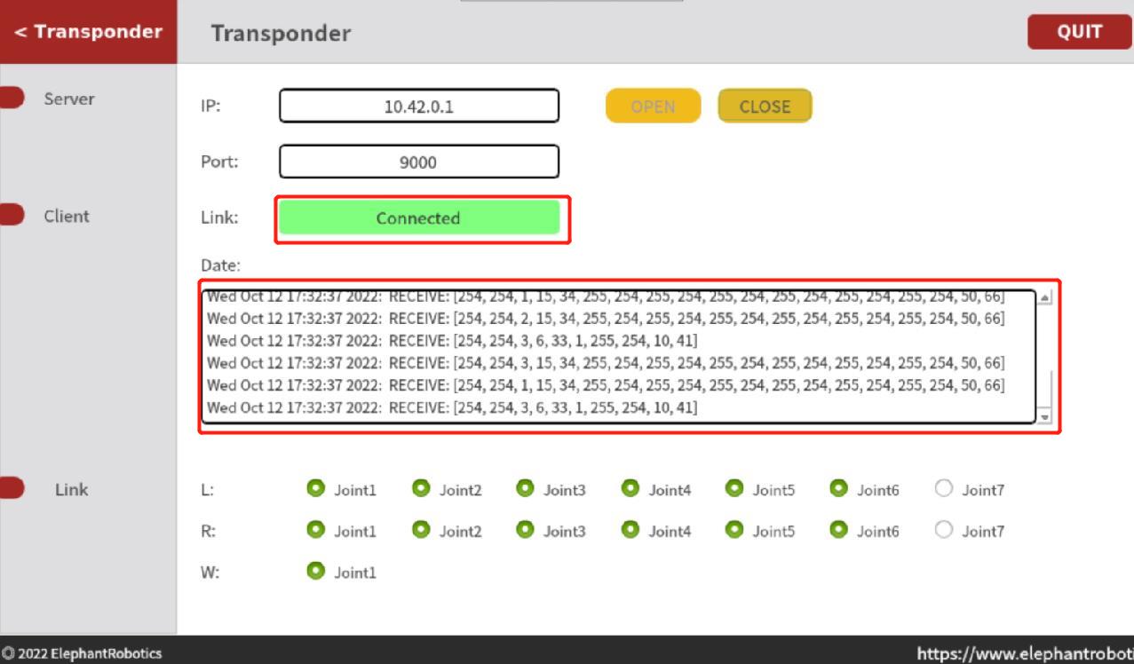 若客户端成功连接到服务器,则页面显示"Connected",并开始接收数据: