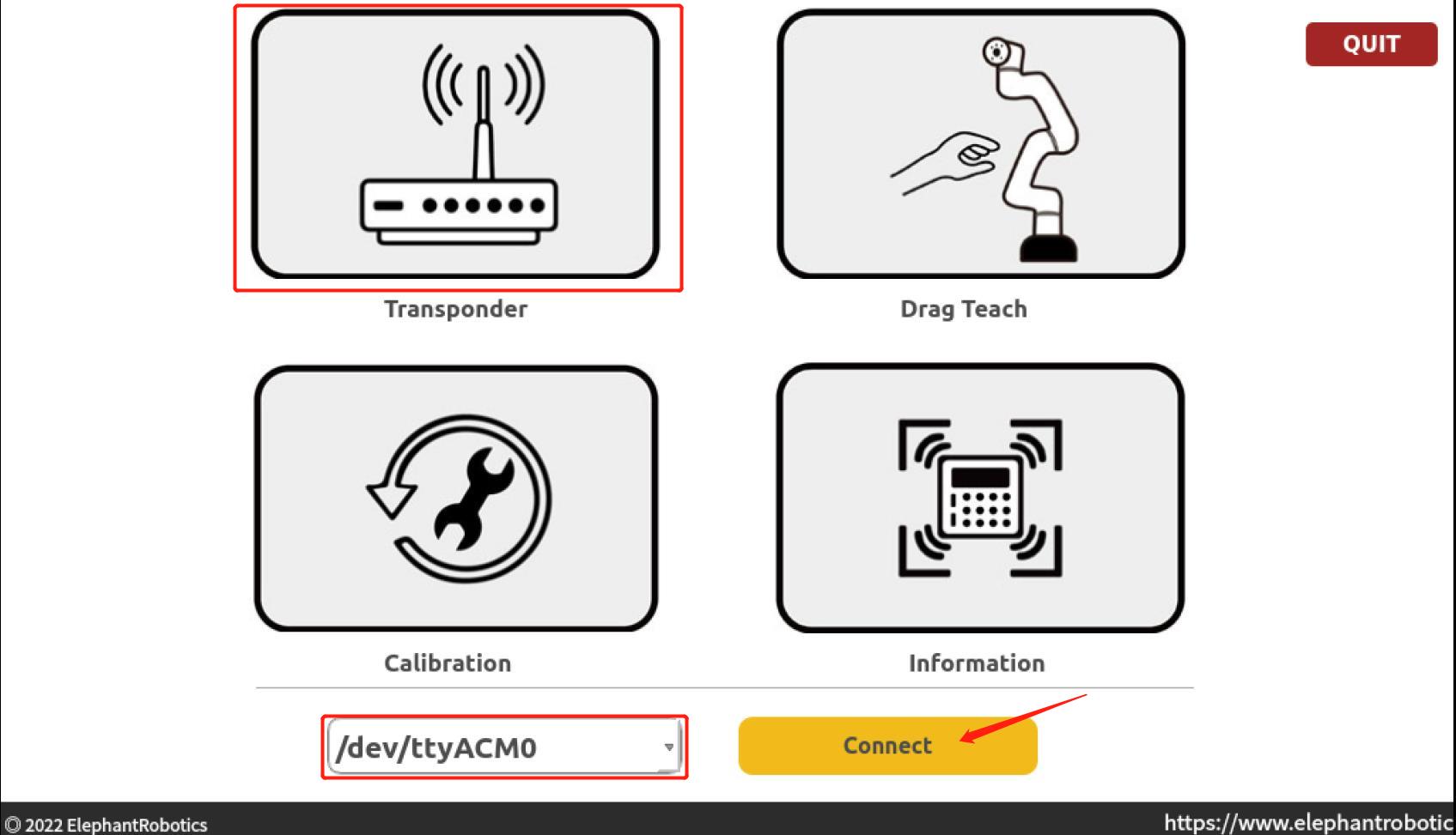 2.选择 “Transponder”, 端口选择 “/dev/ttyACM0”, 点击 “Connect”