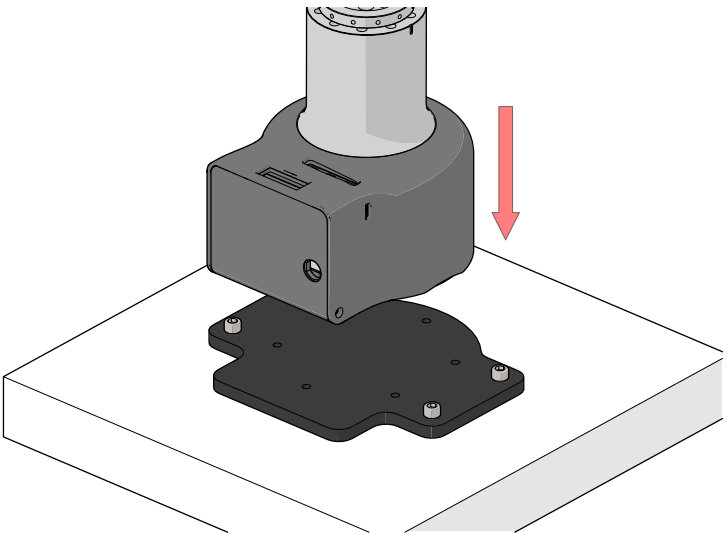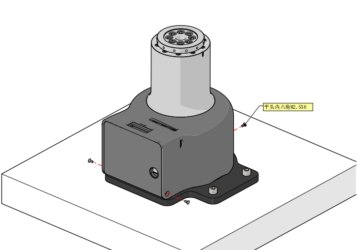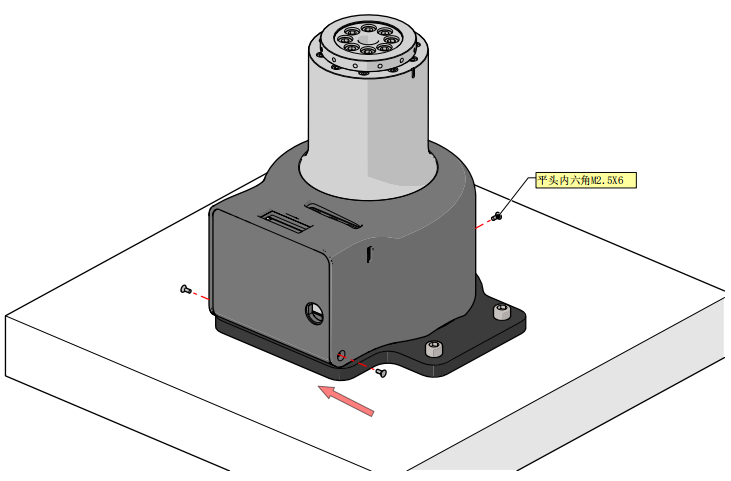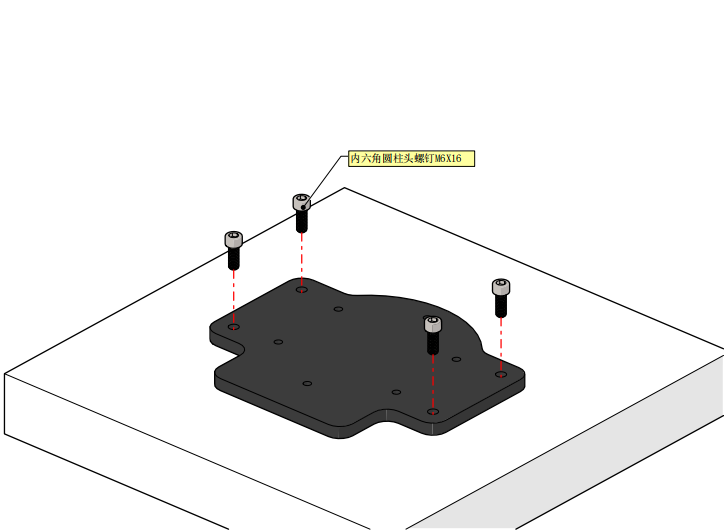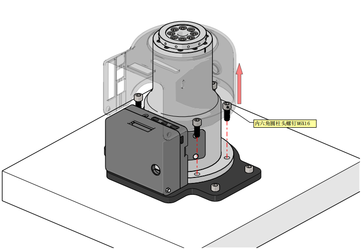 2.5 打开机械臂底座的罩壳,并使用M6X16的螺丝将机械臂底座和底板固定
