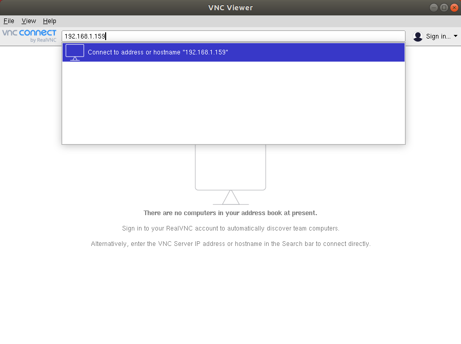 3.2.2 在远程端打开软件“VNC Viewer”,如图2-3所示,在输入框输入机器人的IP地址,按下回车键进行连接.