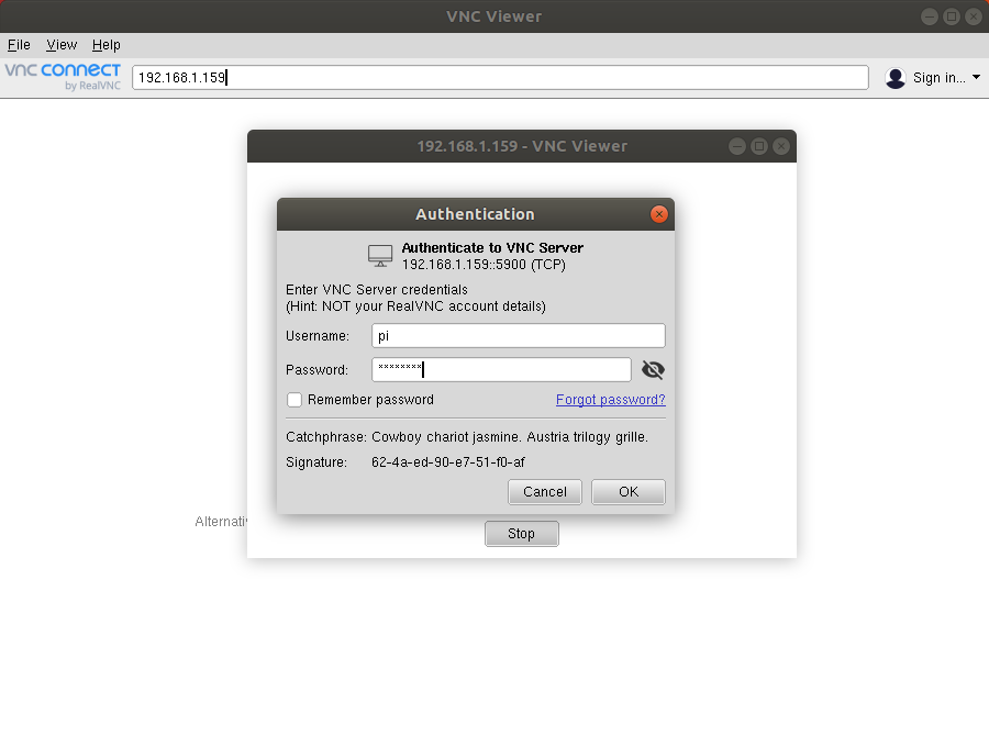 3.2.3 如图2-4所示,在弹出的认证窗口中,输入机器人端的账号和密码,默认账户名为“pi”,密码为“elephant”。输入完成后点击“OK”按钮即可连接.
