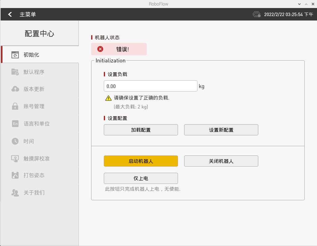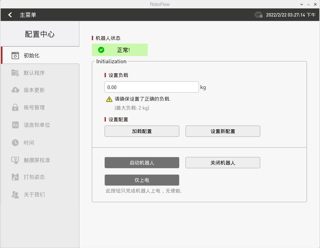 在确保急停旋钮未被按下的情况下,点击如图2-9所示的“启动机器人”按键。此时界面将会发生变化,将会出现如图2-10所示的“正在上电中”图标。如若上电成功,将会出现如图2-11所示的“正常”状态。如若失败,请检查是否缺少执行哪些步骤。