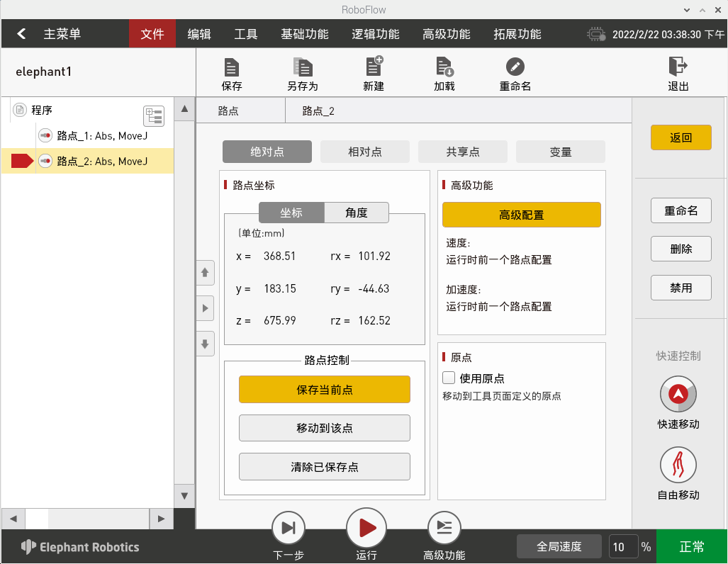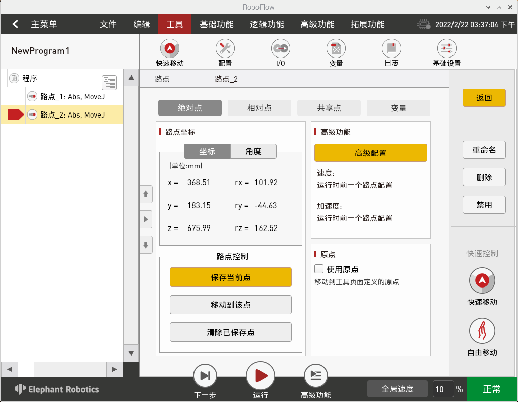 如图2-15所示,添加两条路点:绝对点指令,并示教两个点位(即利用快速移动工具手动操作机器人,控制机器人运动到某一位姿,返回,点击“保存当前点”。两个点位的示教步骤相同。如需验证保存点位,长按“移动到该点”按键可以手动操作控制机器人移动到示教点位。)。