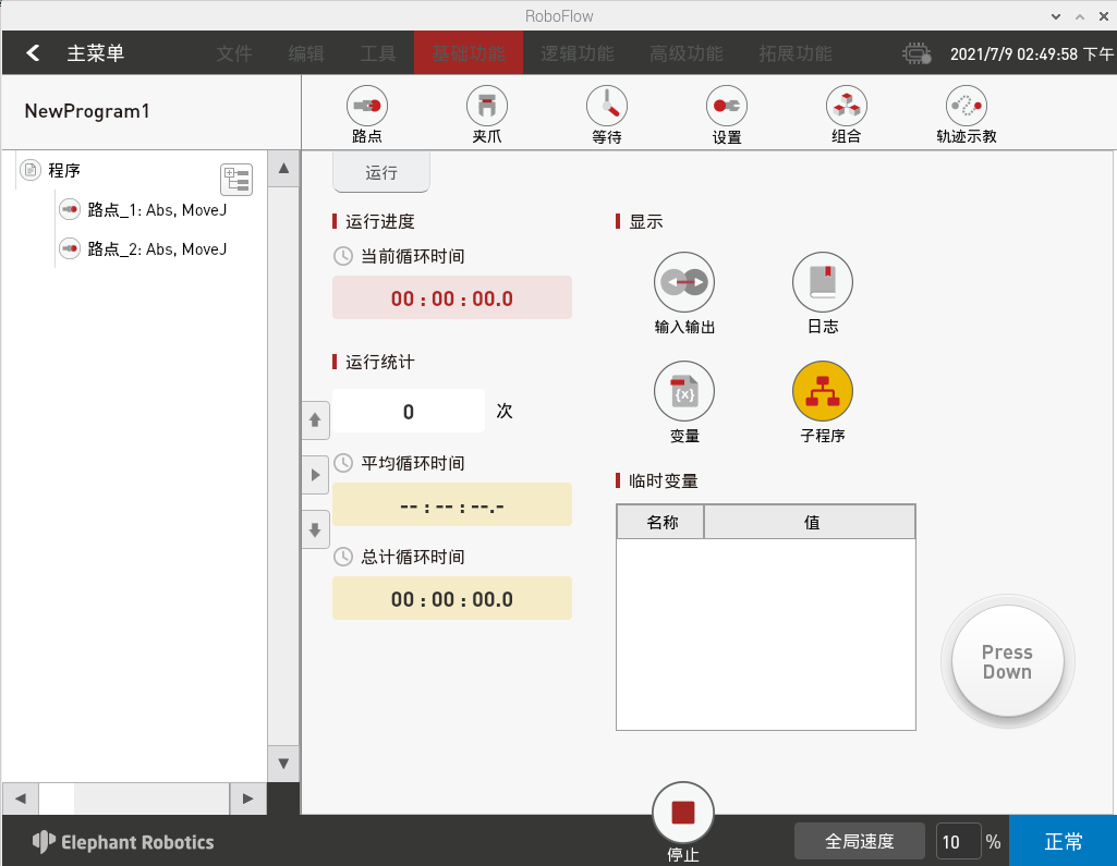 如果使用手动模式调试程序,需要一直按住“Press Down”按键,才能继续运行。如果松开按键,则程序暂停,再按下,则继续运行。