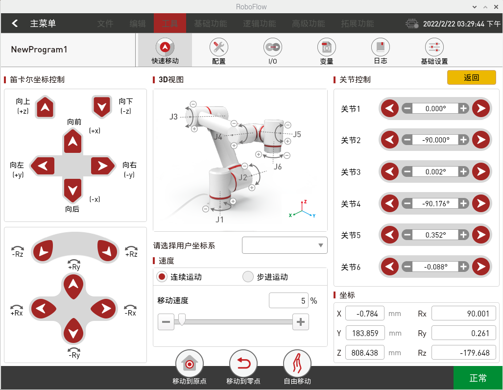 如图2-13所示,点击“快速移动”,将弹出如2-14所示的窗口。控制方式分为笛卡尔坐标控制和关节控制。移动的运动模式可选连续运动和步进运动。