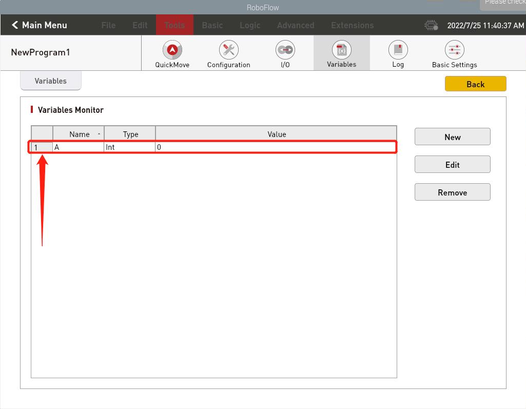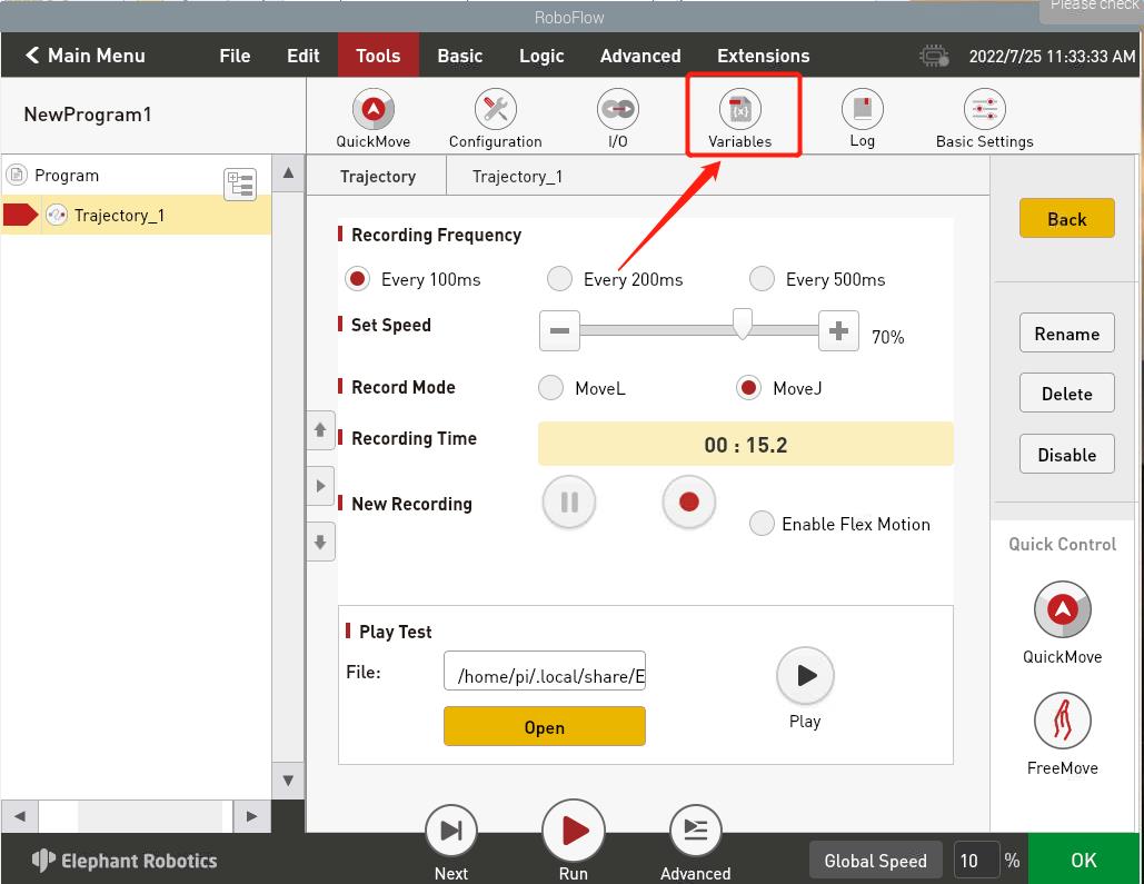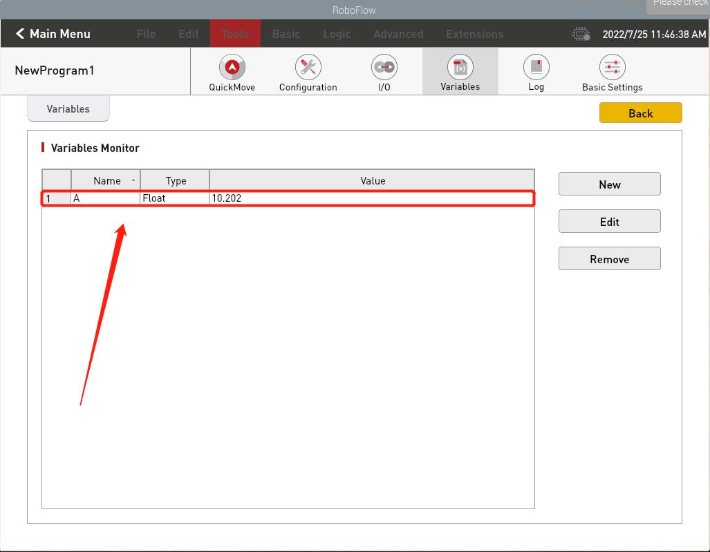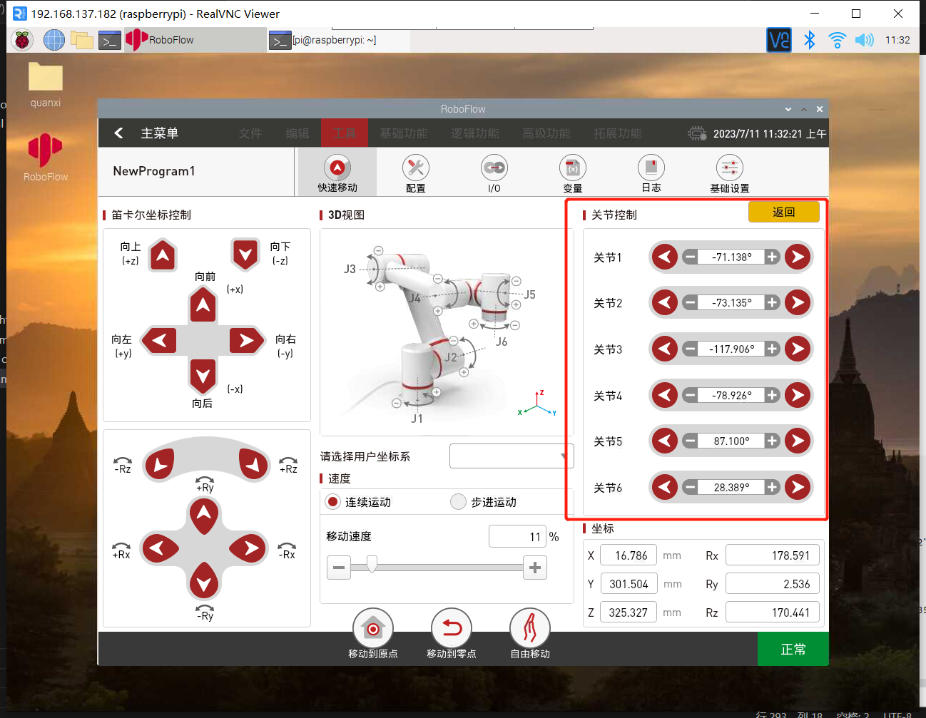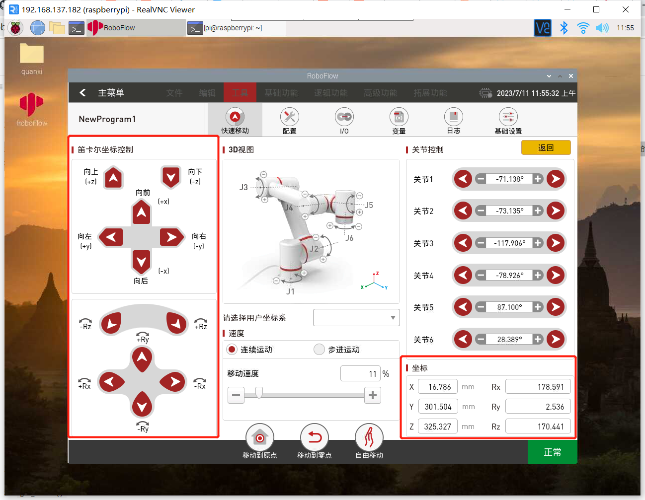 使用VNC Viewer进入RoboFlow系统后,在快速移动界面下,可通过关节控制,控制机器人到达目标位置后,记录操作面板上显示的机器人6个关节的角度