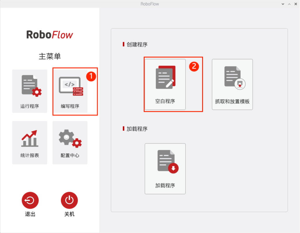 如图5-86所示,给机器人上电后,依次点击“编写程序”、“空白程序”,进入程序创建页面。