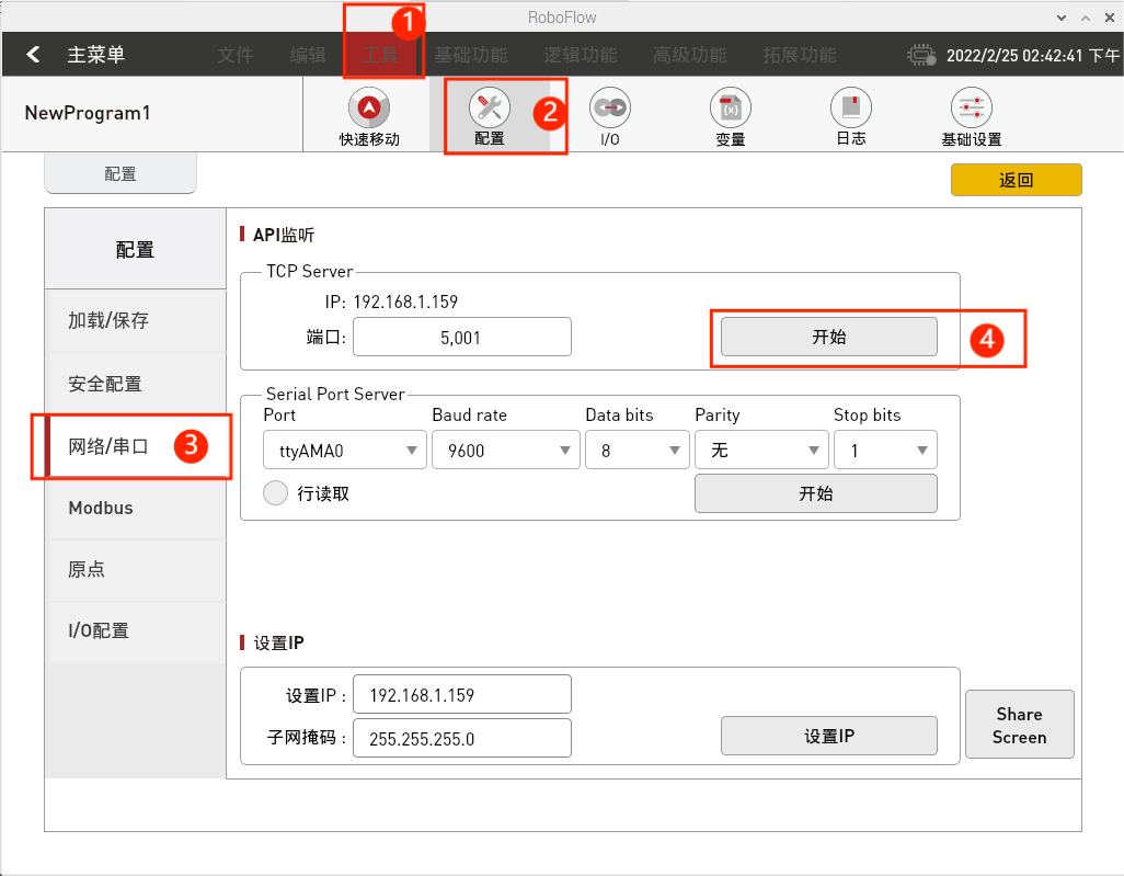 如图5-87所示,依次点击“工具”,“配置”,“网络/串口”进入API监听页面。填写TCP Server的IP地址并设置端口号,IP地址可以在命令行终端通过ifcong命令查看,端口号建议设置区间为1024到49151。