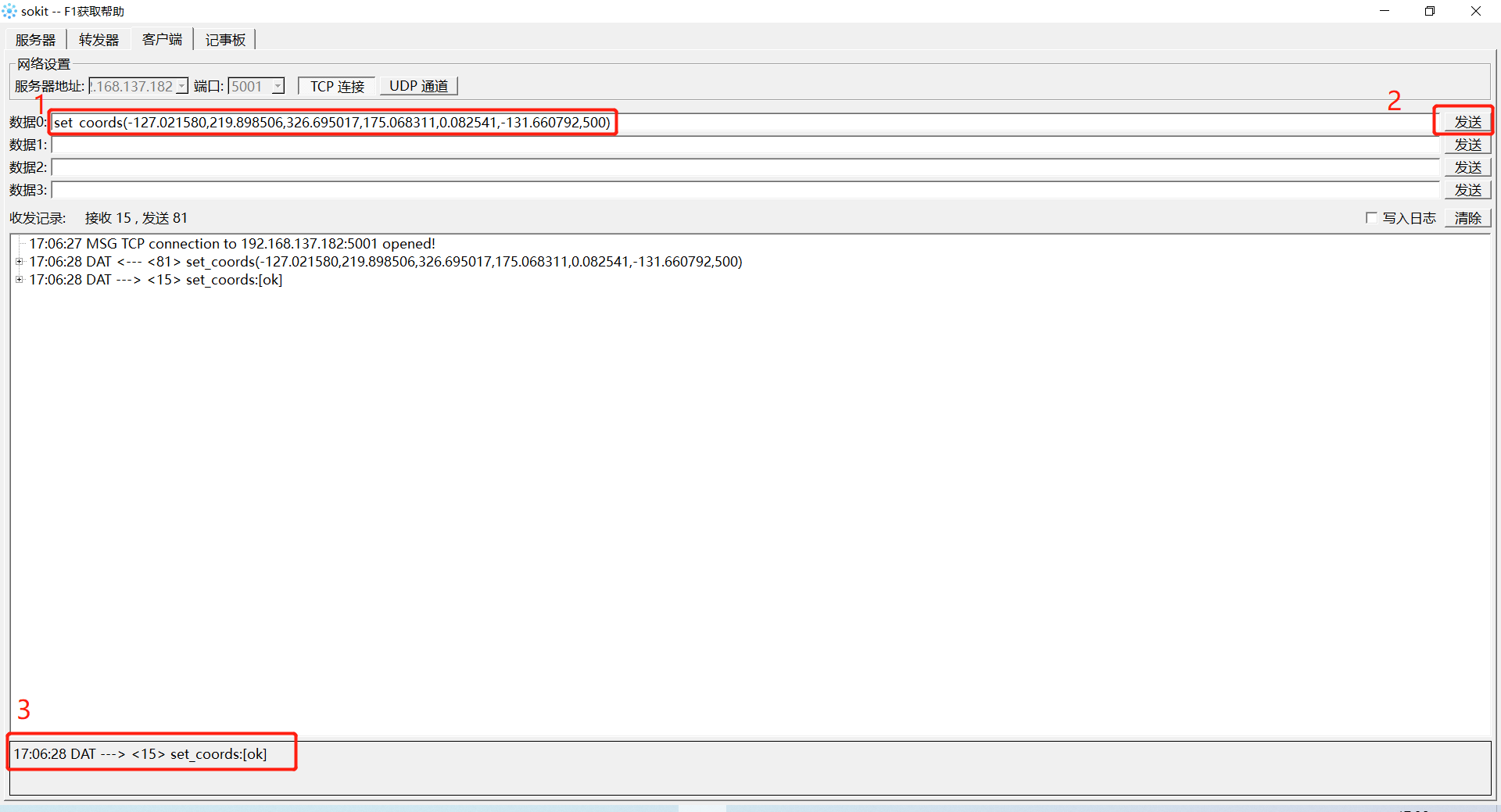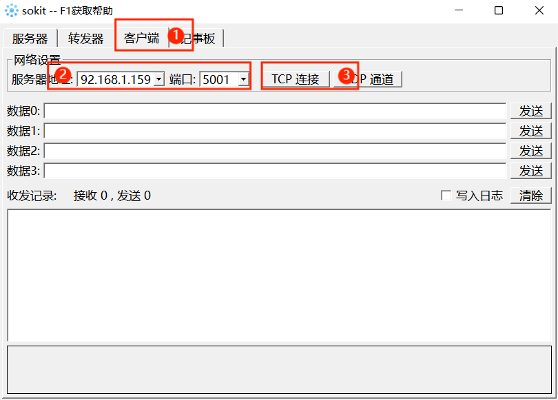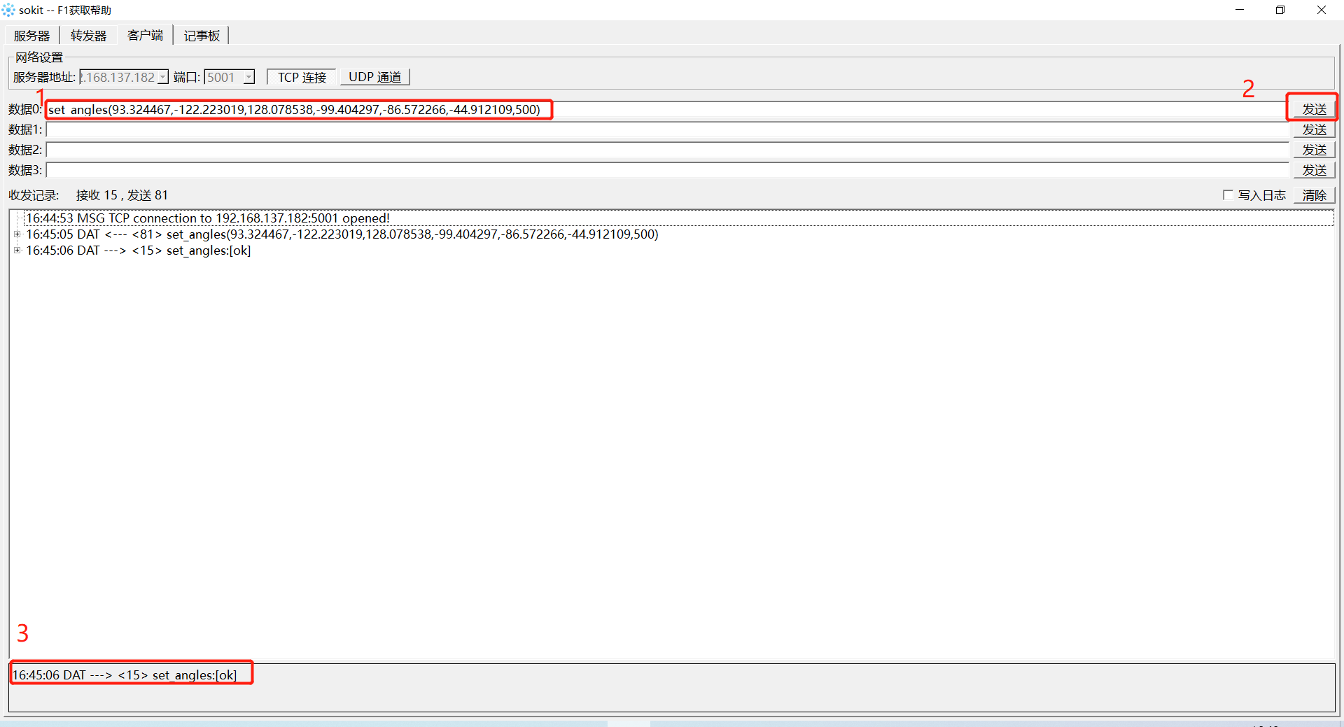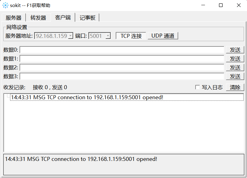 如图5-88所示,在个人电脑端打开软件“sokit”,点击软件上方的“客户端”,进入网络设置页面。服务器地址与端口号填写RoboFlow中设置的值,点击TCP连接即可连接到机器人。若连接成功,则会显示如图5-89所示的信息。