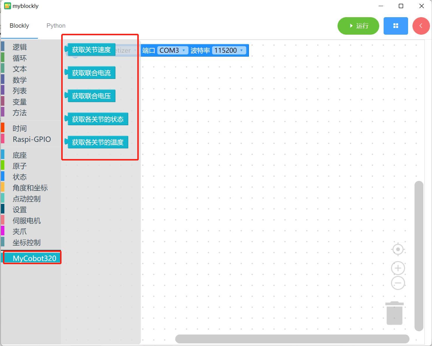 4.在模块栏左下角处为MyCobot 320专门设立了一个方法模块,该模块不会对其他系列机械臂使用造成影响,正常运行程序即可(如下图所示)。