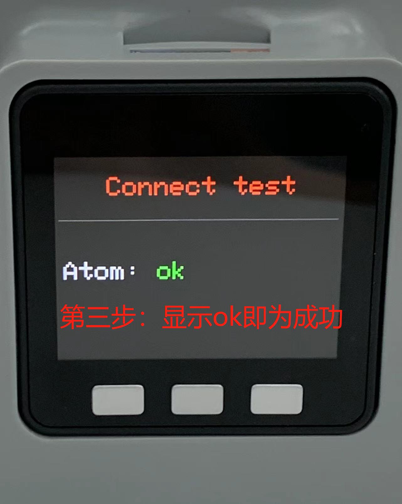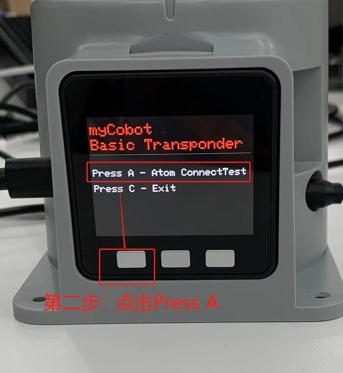 烧录完成后通过底部M5Stack Basic选择Transponder功能(设备出场固件功能之一,详情请参考4.2 出场固件介绍),然后点击Press A。出现Atom: ok提示,即为成功。具体步骤如下所示。