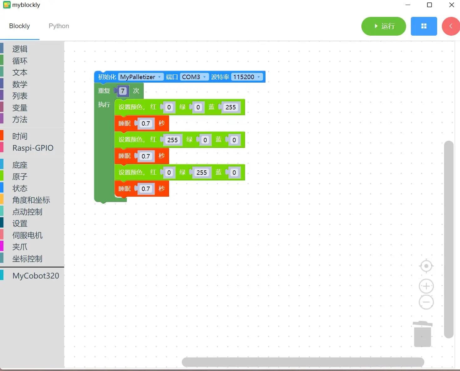 控制机械臂RGB灯板颜色由“蓝-红-绿”顺序变化,整个过程循环七次。