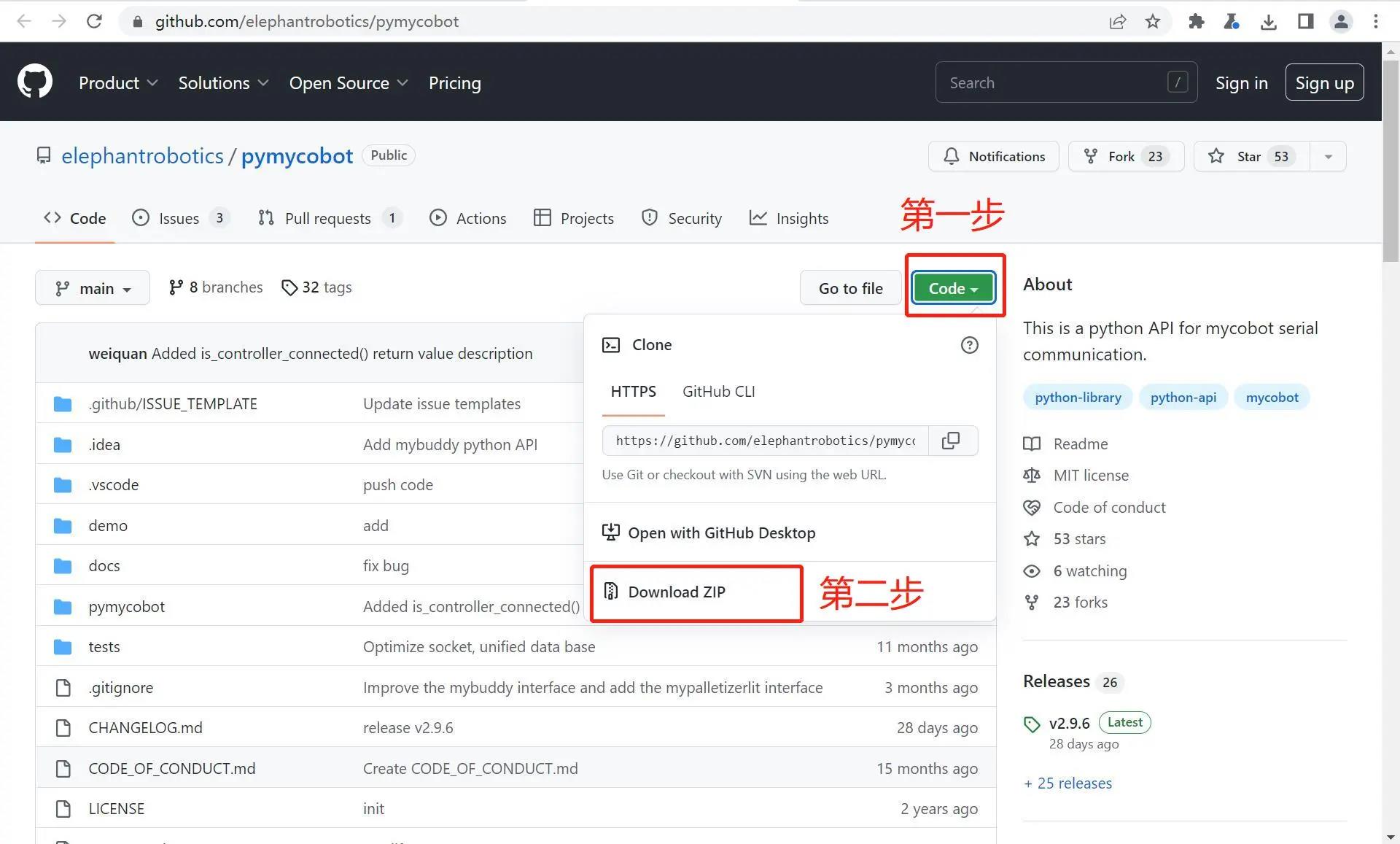 首先,进入项目地址:https://github.com/elephantrobotics/pymycobot。然后点击网页右边Code按钮,再点击Download ZIP下载到本地,将压缩包pymycobot文件项目中的 pymycobot文件夹放入你python依赖库目录中,就可以直接导入使用。