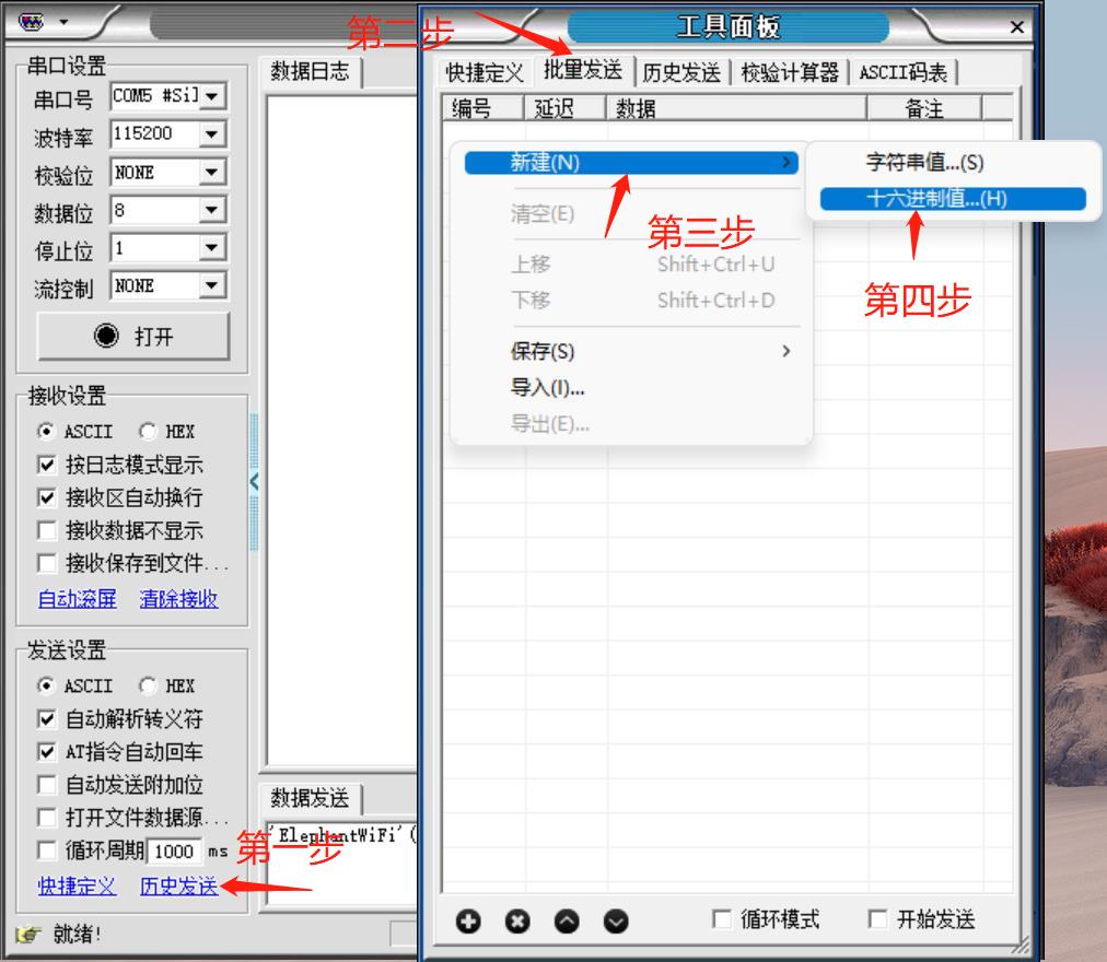 Step 4: 进入APP后,点击“历史发送”,点击“批量发送”,空白处右键,点击“新建”,选择“十六进制值”。