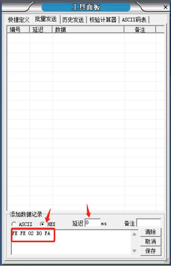 Step 5: 数据类型选择HEX,输入FE FE 02 B0 FA,延迟修改为0,点击“保存”。