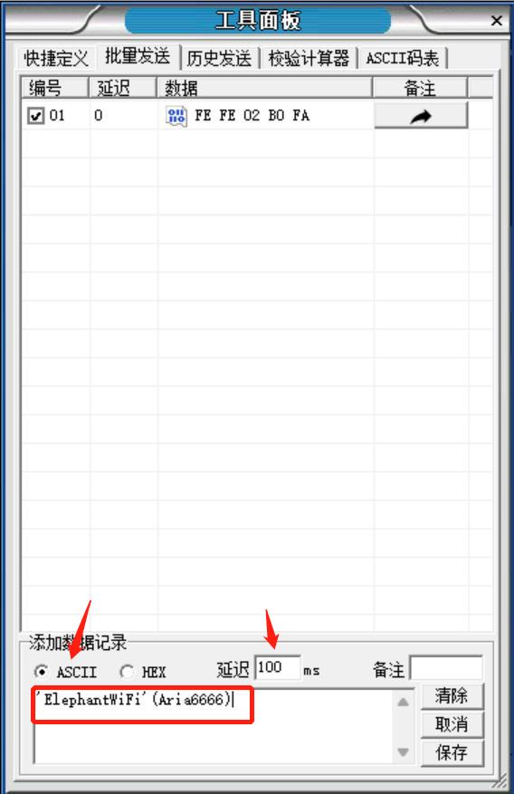 Step 6: 继续添加数据记录。数据类型选择ASCⅡ,输入你所处环境的可用wifi名称和密码,延迟设置为100ms,点击“保存”。