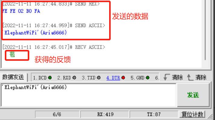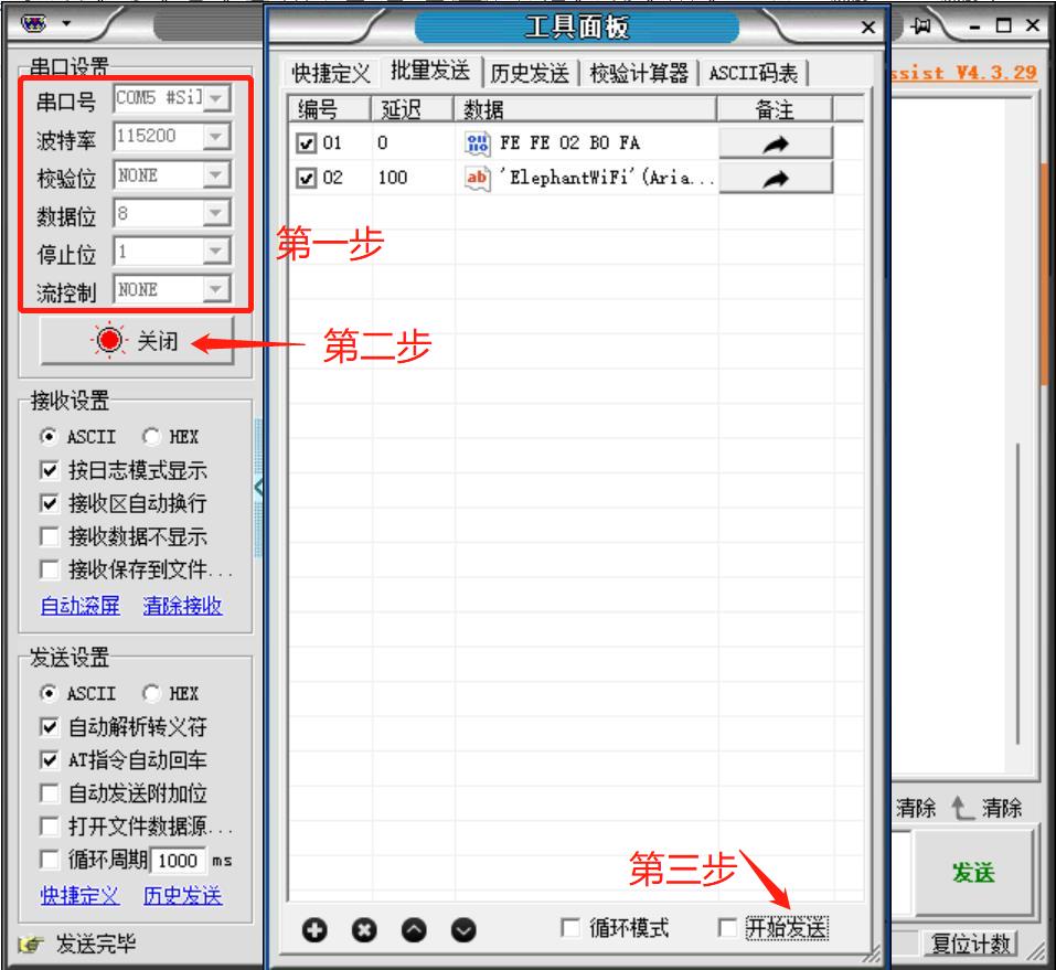 Step 8: 选择串口号,点击“打开”,选中这两个指令,点击“开始发送”。