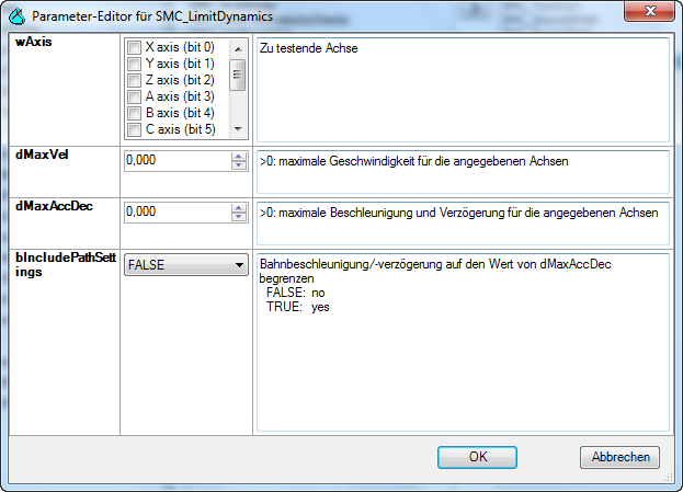 在这个对话框中可以对功能块实例的 ⇘ 路径预处理输入接口进行编辑。请注意并不是所有的输入变量都是可见的。 (可对一个初始值的初始化进行编辑。) 第一列中包含输入的名称,第二列显示可以进行改变的变量值并且可以通过下拉菜单或者选框进行选择。最后一列是输入参数的注释。